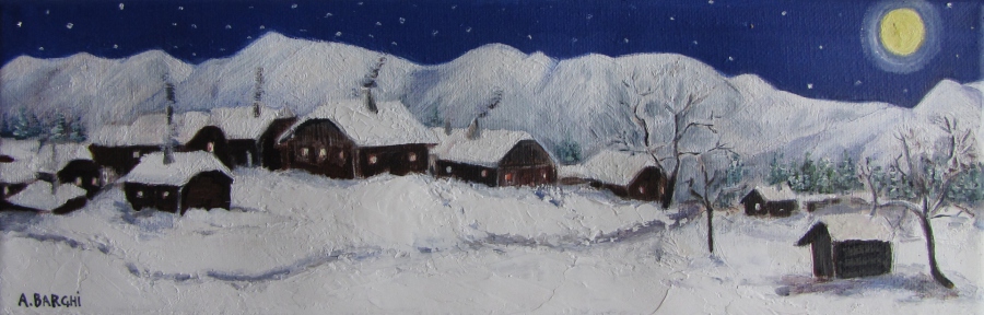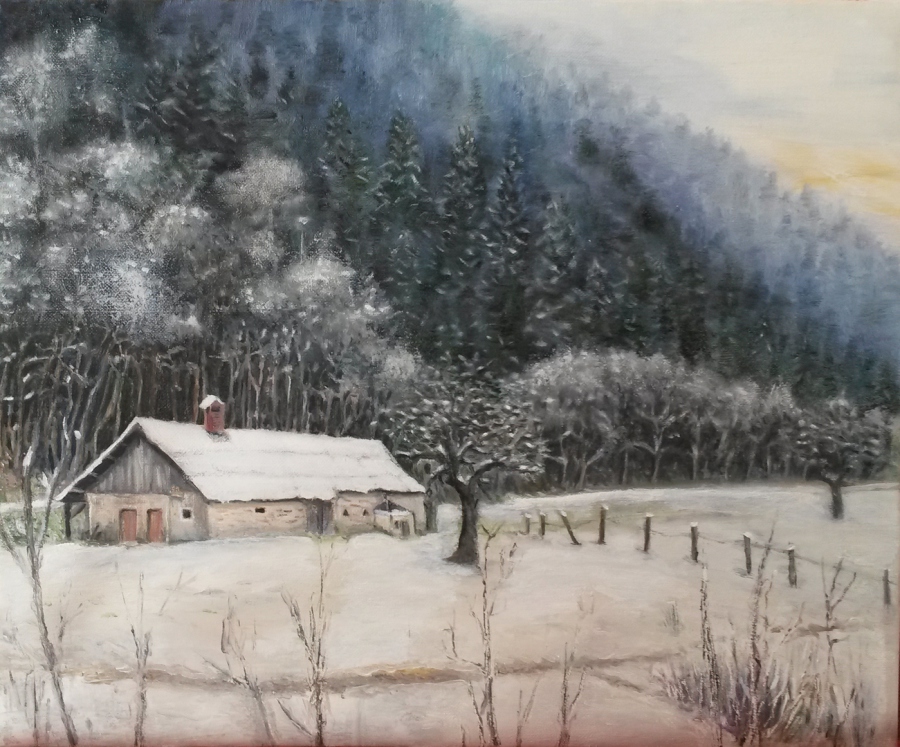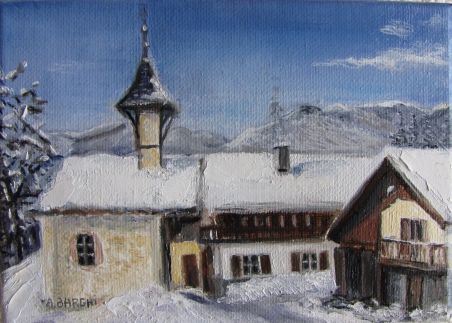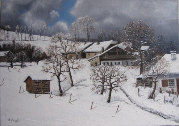 Huile sur toile- 46 x 54,5 - Megève " Soir à la ferme"