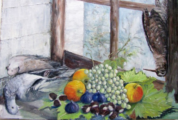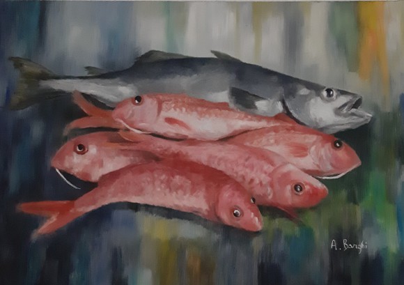 Huile sur toile - Rougets barbets et lieu jaune- 55 x 38 -