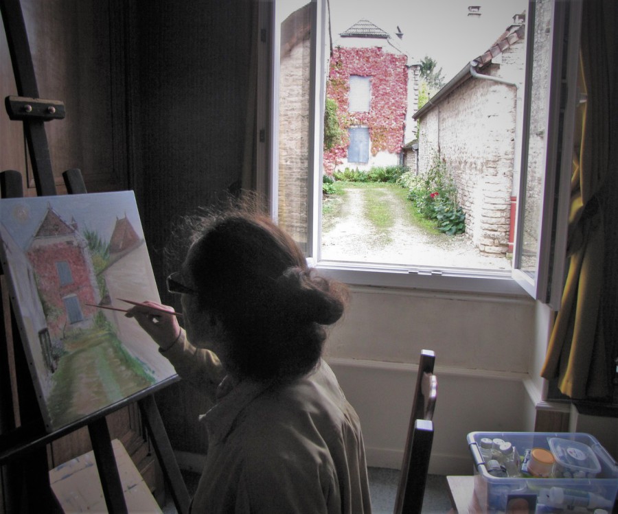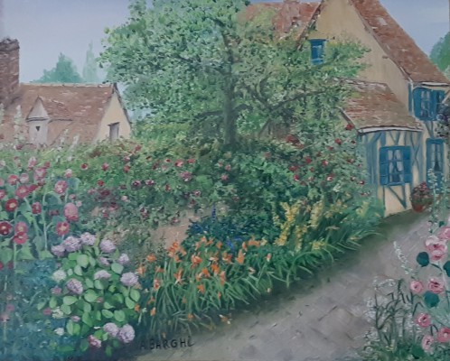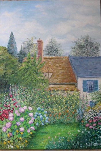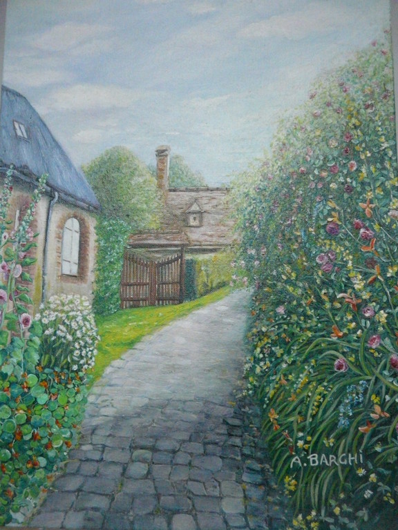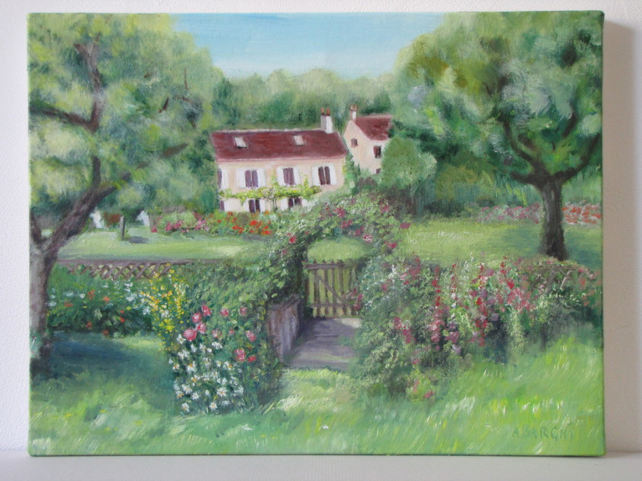 Huile sur carton toilé - Petit jardin à Gerberoy en Picardie -