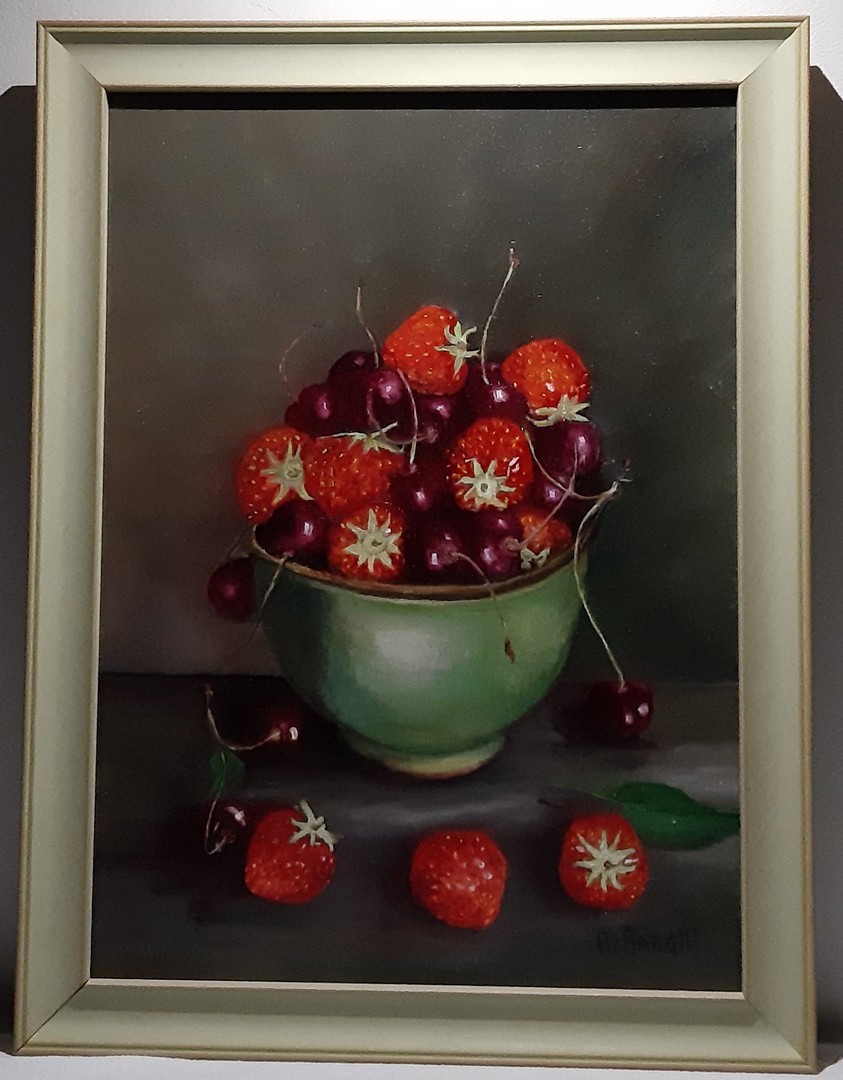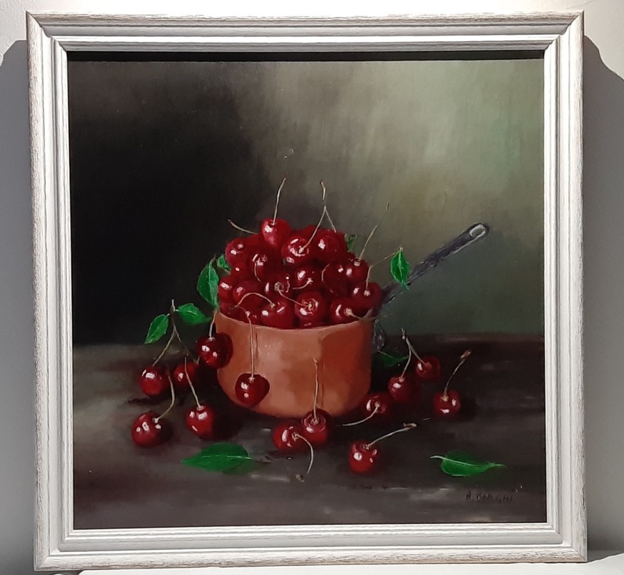 Huile sur bois - Cerises - 40 x 40 - Encadré -